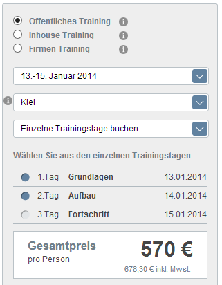 bei Computerkurse von medienreich Computertrainings dort kann man, nachdem auf der rechten Seite Ort und Datum ausgewählt wurde, der Kurs selber zusammengestellt werden