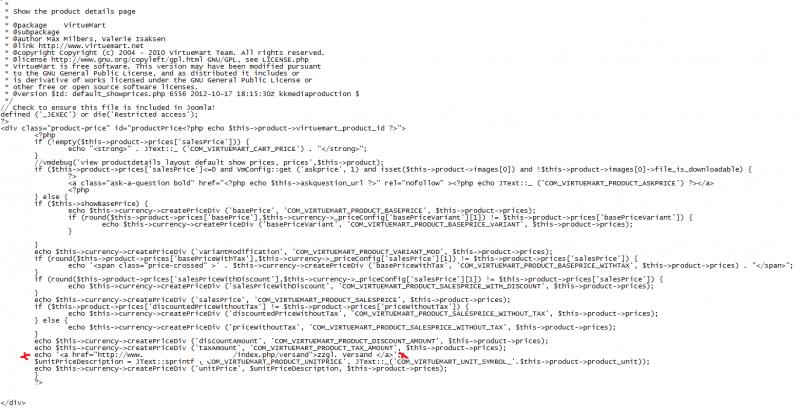 vielleicht wird so klarer, was ich falsch mache. Oben steht ja alles sehr klein und ist kaum lesbar. Das hier steht bei mir am Ende dieses Pfades: \components\com_virtuemart\views\productdetails\tm pl\default_showprices.php